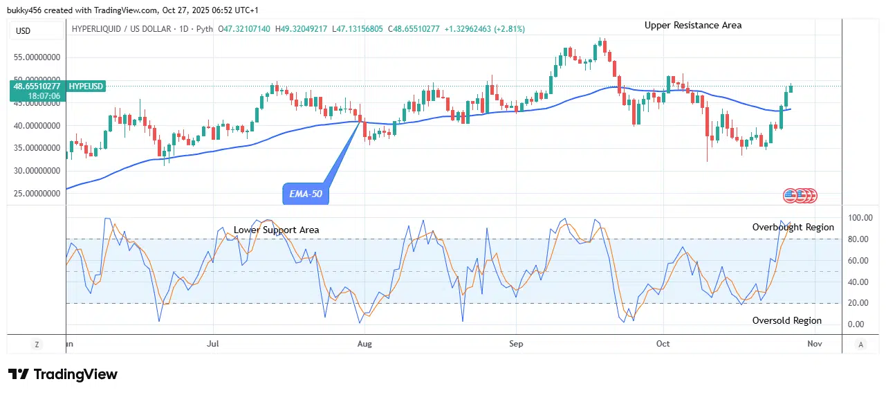 When writing the article, the price of HYPEUSD was driven above the key level today by more purchasing pressure, moving from the $48.09 value to the $49.32 resistance level above the EMA-50.