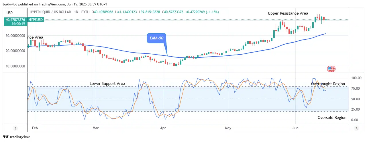The HYPEUSD price at the $41.13 resistance mark above the EMA-50 as the 4-hour chart commences suggests an uptrend, strengthening investors’ confidence in altcoin and driving expectations for future gains.