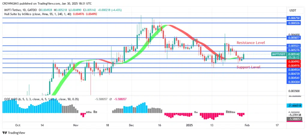 IMPT is doing well, according to the 4-hour chart pattern. The bulls have been putting pressure on the cryptocurrency’s performance on the 4-hour chart. after the breakthrough in long-term consolidation. The price keeps rising. The $0.0052 resistance level will be investigated soon. The buyers’ drive halted the sellers, and it is currently targeting the $0.0052 level.