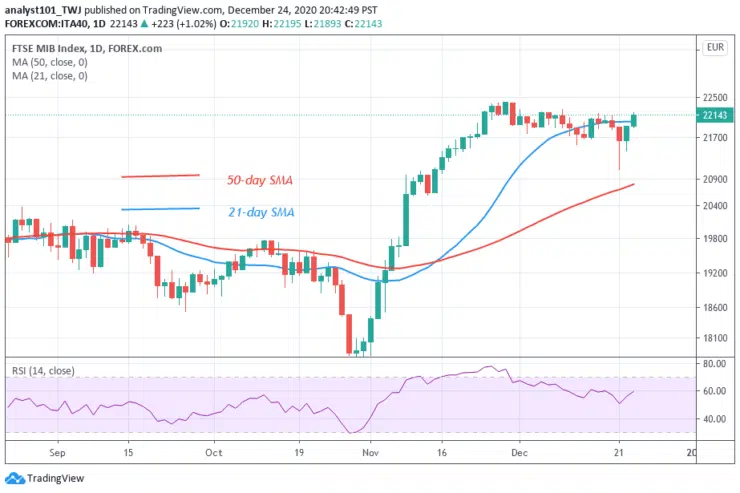 On the 4- hour chart, the index is in an upward move. On December 16 uptrend, the ITA40 was resisted. The retraced candle body tested the 61.8% Fibonacci retracement level. This indicates that the index will rise to a level of 1.618 Fibonacci extension level. That is a high of 22469.