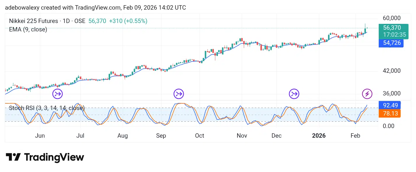 Price activity in the Nikkei 225 market has maintained a long-term upward trajectory. The market earlier established a base above the 50,000 price mark and subsequently pushed higher.