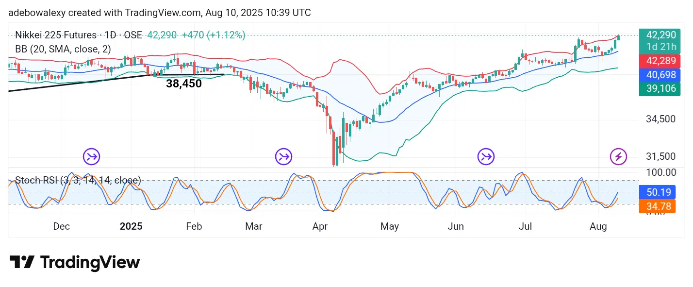 On the NIKKEI 225 4-hour chart, the last two sessions show a consolidation phase, keeping the market firmly above the 42,000 support level. The BB indicator remains well-spread, signaling room for further gains.