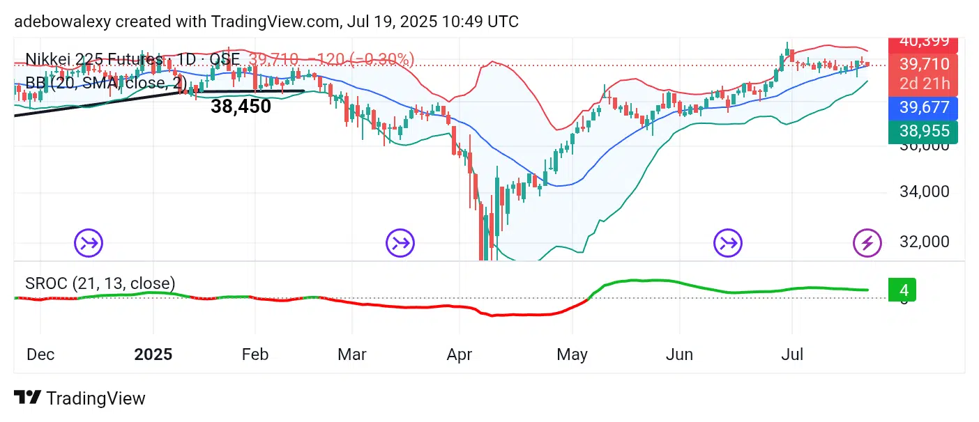 On the NIKKEI 4-hour chart, price action has slipped slightly below the middle band of the BB indicator. The latest candle is solid green with a small body, reflecting some buying pressure. Similar to the daily chart, the SROC indicator line here continues a sideways movement above the equilibrium line.