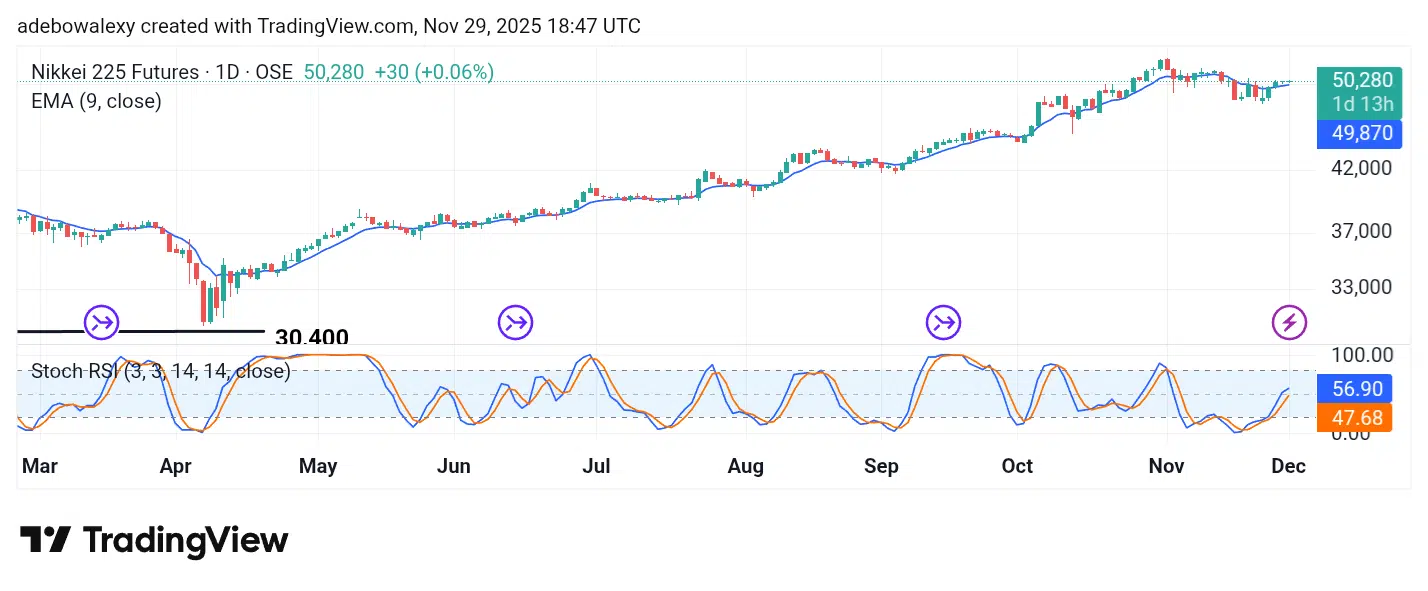 For two sessions, price action in the NIKKEI 225 daily market has stayed green and above the 9-day Exponential Moving Average (EMA) line. However, price action can be seen remaining in nearly the same spot for two sessions.