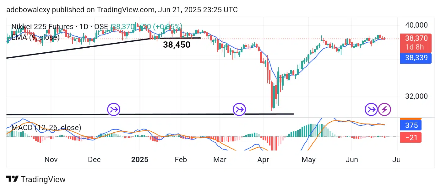 The Japan 225 daily chart shows that price action has gently descended toward the 9-day Exponential Moving Average (EMA) line. However, over the past two sessions, the market has been moving sideways, hovering just above the 9-day EMA.