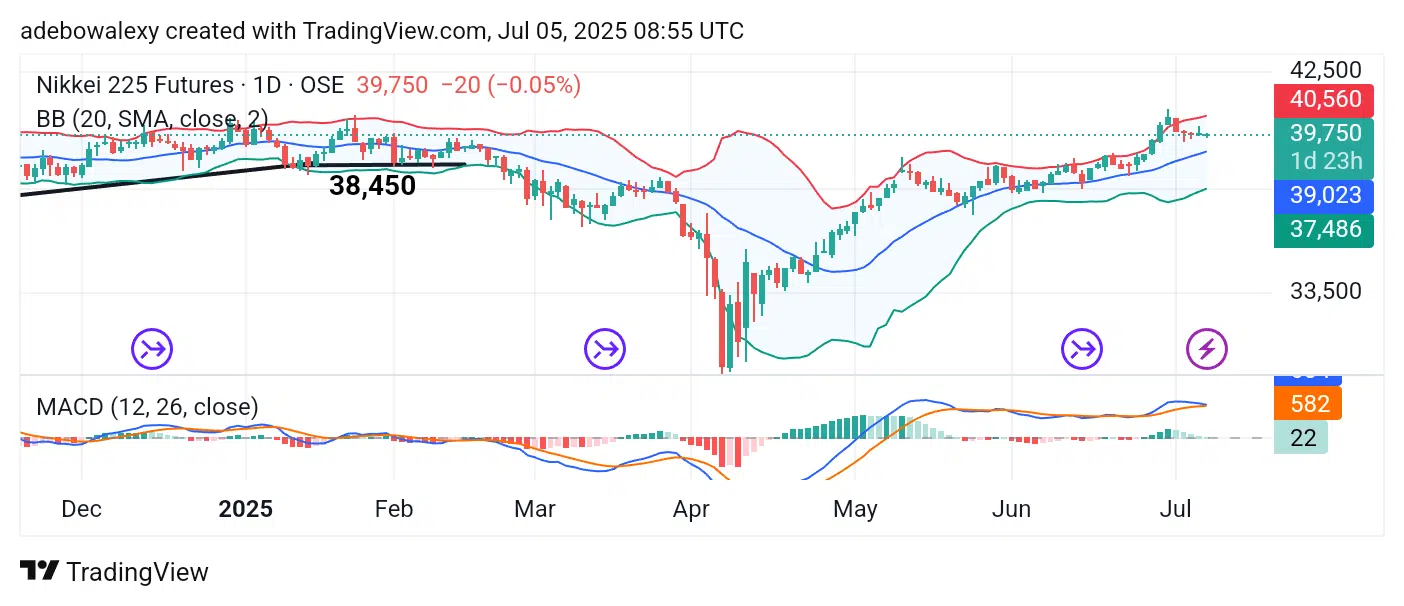 On the 4-hour chart, the Nikkei market shows price activity with a hovering characteristic, reflecting a lack of decisive direction. Price action remains slightly below the middle band of the BB indicator, while the upper and middle bands are now appearing narrower than before—signaling a squeeze and low volatility.