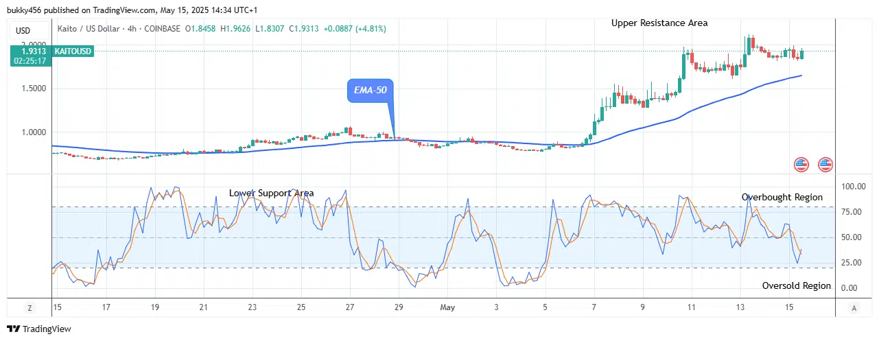 In the 4-hourly time frame chart, the KAITO price showed a silent recovery under the influence of a rising trend line at $1.962 value above the EMA-50.