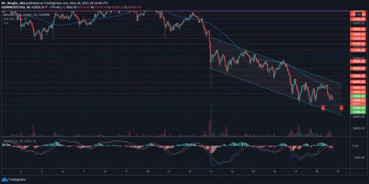 Following a failure to capitalize on a modest bullish wave earlier today, the primary has come under fresh bearish pressure and could post a leg down over the coming hours. The benchmark cryptocurrency could plummet below the $42k mark and lower over the coming hours as selling activities continue.