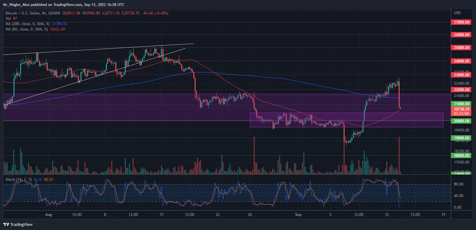 BTC suffered a sharp decline today after the inflation number from the US Department of Labor came in hot. The 8.3% inflation rate in the US indicates that the Federal Reserve can keep its quantitative tightening measures in place, which rings bad news for Bitcoin and other risky markets.