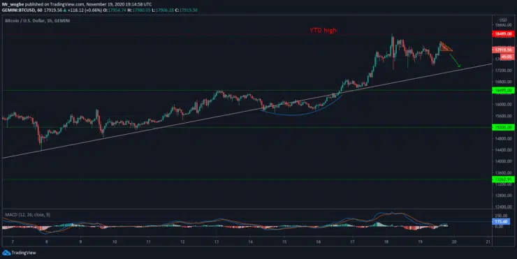 BTC has entered into a consolidation range, as we anticipate a modest price correction in the coming hours and days. Already, Bitcoin has formed a bearish flag, further solidifying the prospects of a dip. A dip from this level is going to be caught by the $17,200 support. Further declines below that level could send Bitcoin on a longer bearish extension.