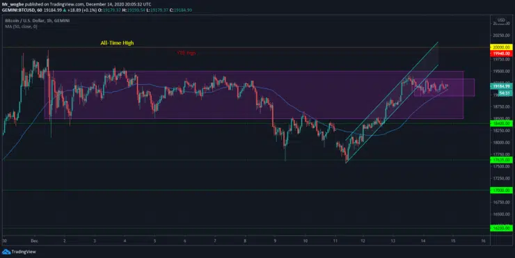 Bitcoin is now trading within a tight range between $19,336 and $18,977 as its recent bull momentum dies out. That said, a break above the $19,500 mark could send it back into its ascending channel and precipitate a sharp rally above the highly-anticipated $20,000 all-time high.