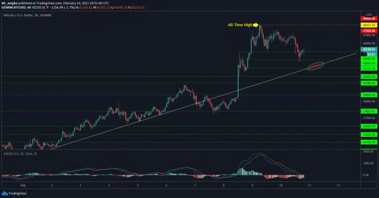 Bitcoin has recorded a significant retrace over the past few hours—as predicted—falling from the $47,500 resistance to the $44k support. The benchmark cryptocurrency appears to be in recovery from the recent dip and is hovering above the $45k area. However, we could still see a continuation of the retrace to the $43k support to perfect a rebound to the upper-$47k area.