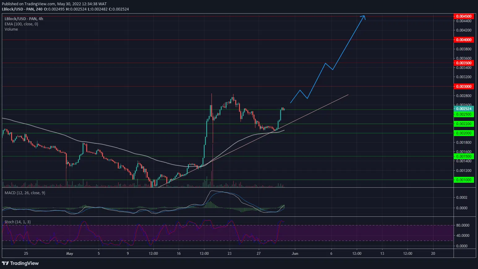 Meanwhile, my resistance levels are at $0.0030, $0.0035, and $0.0040, and my support levels are at $0.0022, $0.0020, and $0.0018.