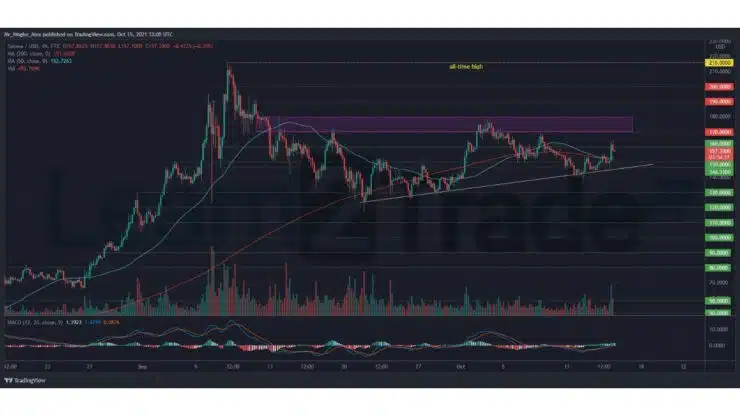 SOL appears to have finally regained some bullish momentum after breaking above the 200 and 50 SMAs earlier today. The seventh-largest cryptocurrency now targets the critical $170 – $180 resistance zone.