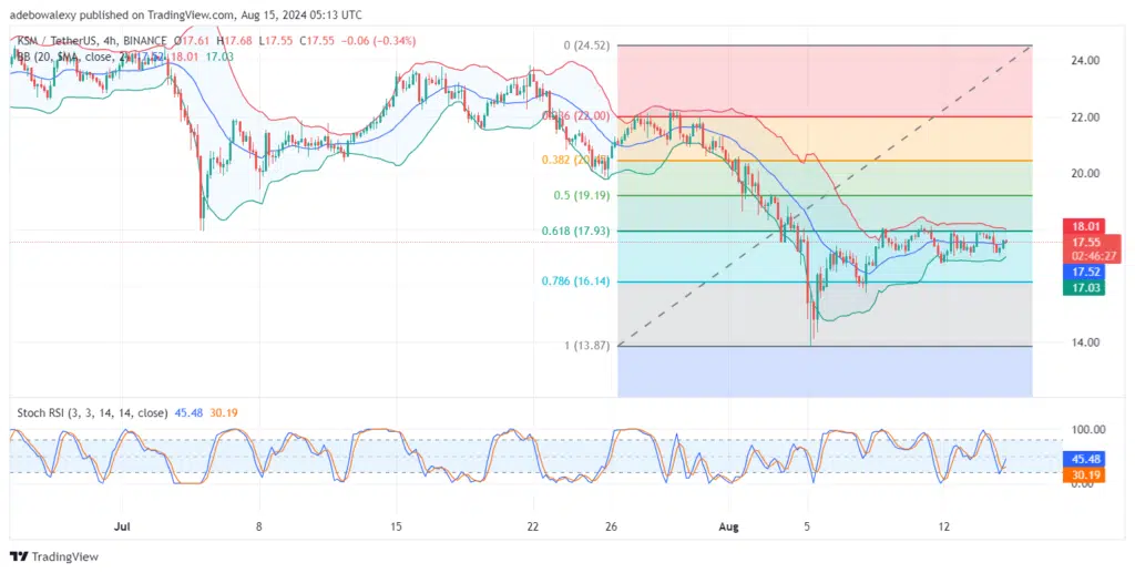In the KSM/USDT 4-hour market, it can be observed that price action briefly pierced through the middle limit of the Bollinger Bands. However, shortly afterward, the subsequent session printed a downward retracement. This caused the token to settle just above the middle band of the Bollinger Bands.