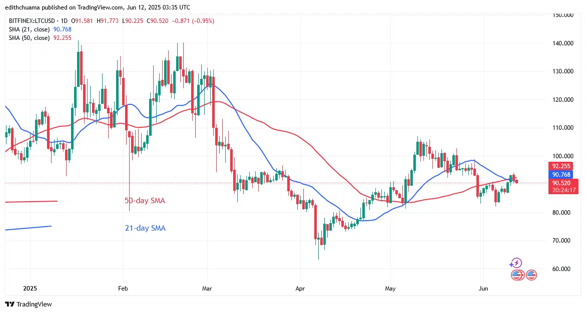 Litecoin’s (LTC) price breaks above the moving average lines and is now below the $94 barrier. Buyers failed to keep the bullish momentum above the moving average levels. The price of LTC struck the resistance and was resisted at $94. The cryptocurrency asset was earlier trading between the $80 support and below the moving average lines.