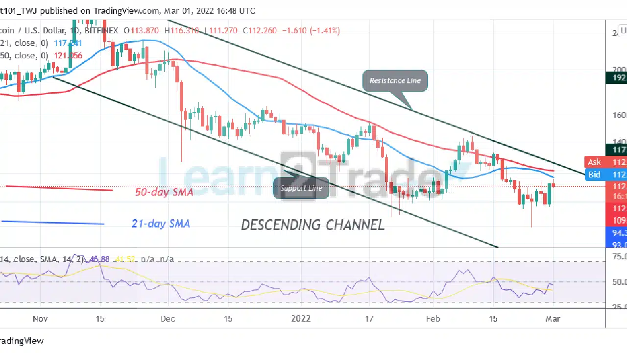 Litecoin’s (LTC) price has been in downward correction but risks a further downward move. The downward correction became necessary as buyers failed to keep LTC prices above the moving averages. Today, LTC price is facing resistance as buyers attempt to break above the moving averages. Since February 21, LTC/USD has been fluctuating between $100 and $116 price levels. On February 10, the bulls made attempt and broke above the moving averages but were unable to sustain the bullish momentum. This resulted in the current downtrend. On the downside, the bulls are likely to defend the current support as it has not been broken.