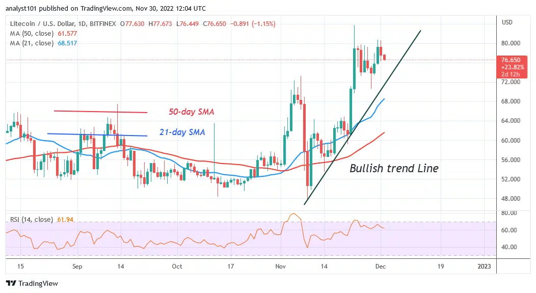 As it aims for the $64 low, Litecoin will be rejected at the $80 level. The altcoin is losing value in the meantime. The price of LTC rose after a downward correction on November 25 and a retraced candle body tested the 50% Fibonacci retracement line. According to the correction, LTC will drop to level 2.0 of the Fibonacci extension, or $64.73.