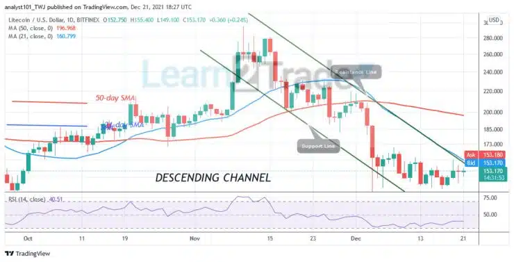 Litecoin’s (LTC) price is in a downward correction but an uptrend is doubtful. For over two weeks, the altcoin has been confined between $142 and $168 price levels. Buyers and sellers have failed to break the range-bound levels of cryptocurrency. For instance, if buyers breach the $168 high and the bullish momentum is sustained, the market will rally to $220. Conversely, if sellers break below the $142 support, the market will decline to $126 low.