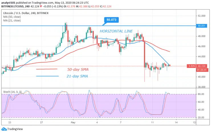 After three unsuccessful attempts to break the $50 overhead resistance, LTC suffers another setback. The market has been falling above $46 support after each resistance. The recent breakdown breaches the support levels of $46 and $44 to reach $39 low. The bulls made a downward correction above $42 and resumed consolidation above it. Nonetheless, with the recent fall, the coin is in the bearish trend zone. A further downward move is likely.