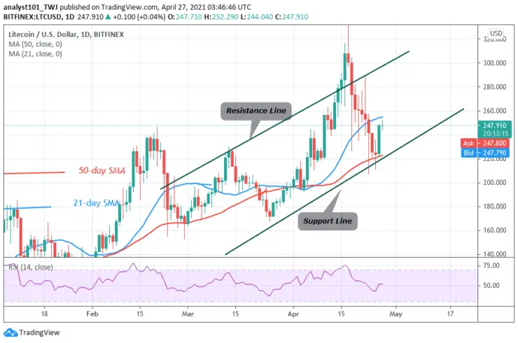 Litecoin has been in a downward movement since April 17. The altcoin fell and found support above the 50-day SMA. In other words, the coin fell above $220 and resumed consolidation above it. LTC consolidated and corrected upward. The upward correction has reached the overbought region of the market. The market upward move is doubtful as price reaches the overbought region. Besides, the LTC price is facing rejection at the 21-day SMA.
