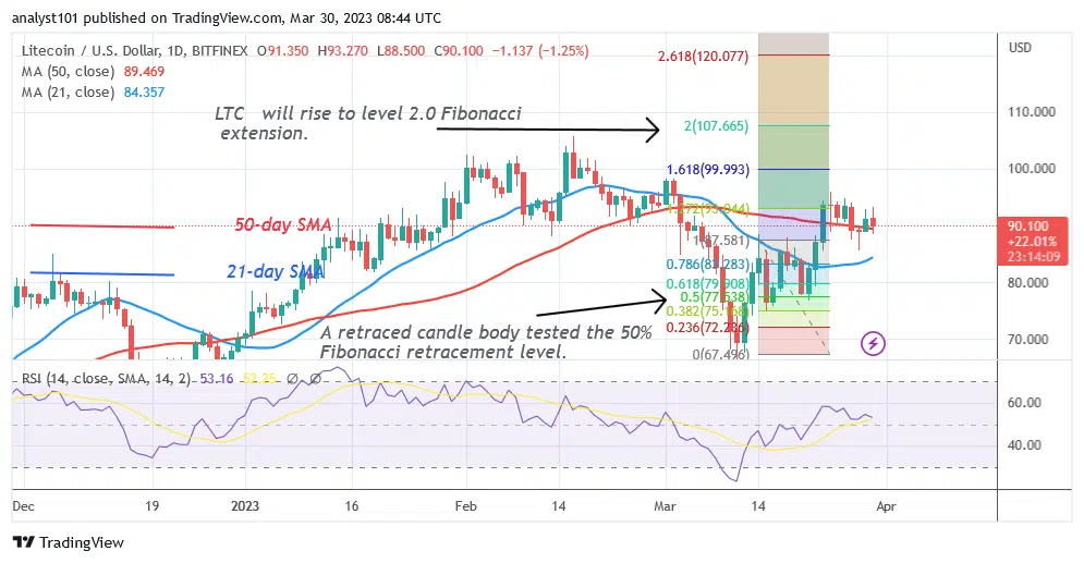 Litecoin (LTC) price is rising as it faces rejection at $95. The present upswing will continue if it stays above the moving average lines. Buyers are pressuring the coin to test its previous record high of $105. The current surge may terminate if the bears’ breach below the 50-day line SMA. The drop will move in a lateral direction. On the upswing of March 24, a retraced candle body tested the 50% Fibonacci retracement line. According to the retracement, LTC will rise to level $107.66, or level 2.0 of the Fibonacci extension. The price movement indicates that the price of LTC has increased above the moving average lines to a high of $90.