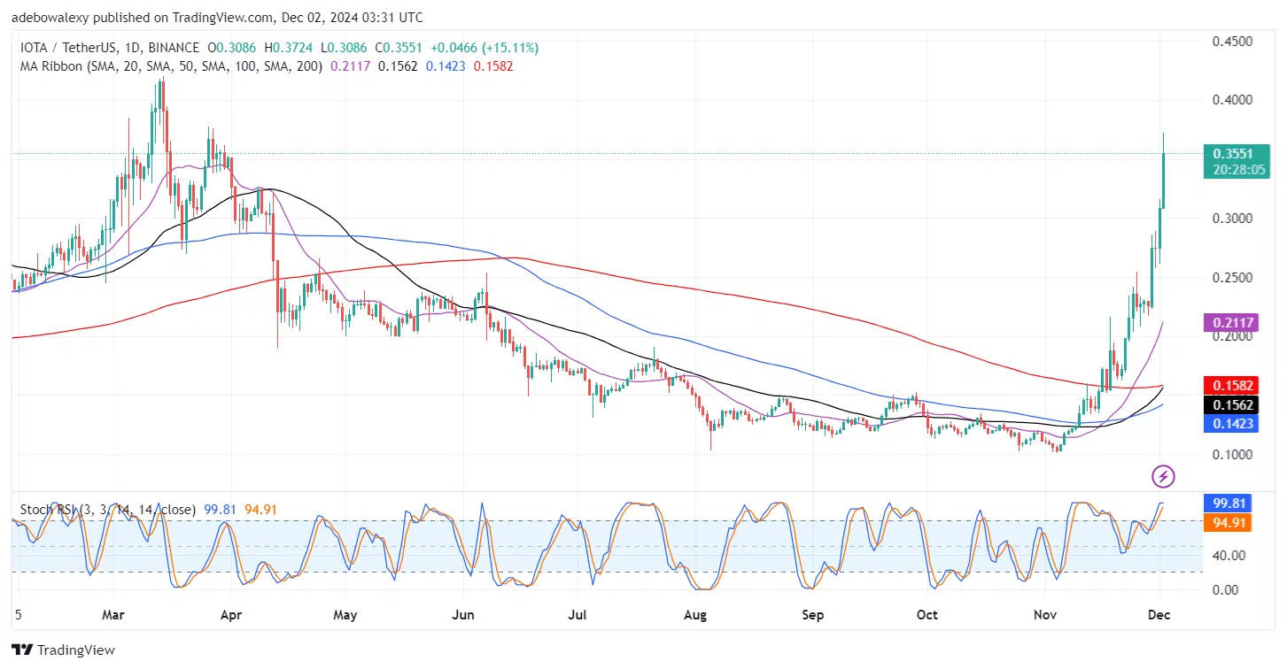 The IOTA/USDT market is rapidly gaining bullish traction. As a result, the token’s price has risen past a threshold last seen about nine months ago. Moreover, trading indicators are still positively biased, hinting that more increases may be seen in this market in subsequent sessions.