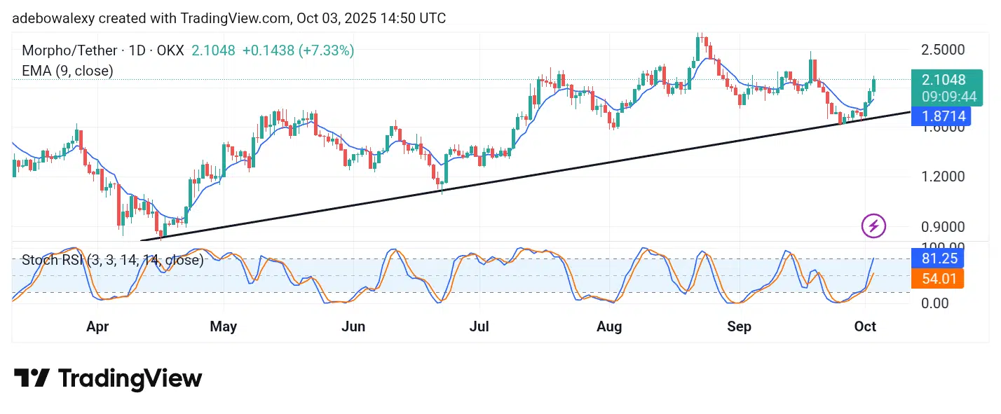 Price action in the Morpho daily market recently rebounded off support near the $1.800 price level. The market subsequently proceeded upward and now trades above the 9-day Exponential Moving Average (EMA) line. The ongoing session remains green and holds sizeable gains above the 9-day EMA curve.