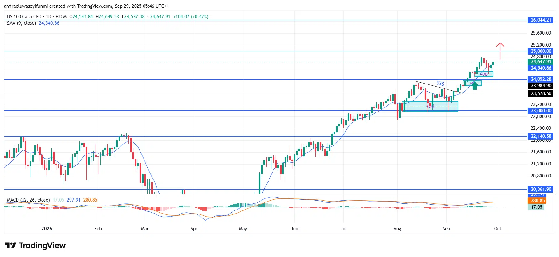 Technically, the index has shown resilience in holding critical demand thresholds, with strong rebounds observed around $23,000 and $24,050, reinforcing market conviction. Recent price action highlights persistent buying interest, as corrective dips into liquidity pockets have been met with renewed accumulation. The continuing pattern of higher highs and sequential lows underscores a structured advance that supports the prevailing bullish bias.