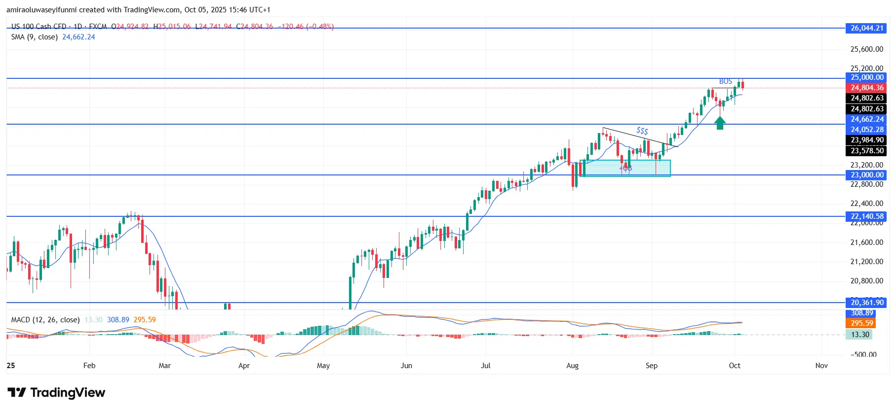 NAS100 maintains a strong upward trajectory with solid technical backing. The NAS100 Index continues to demonstrate a clear bullish bias as prices trade comfortably above the 9-day Simple Moving Average (SMA) near $24,660, indicating persistent demand and firm market confidence. Momentum indicators, including the MACD, remain supportive, with the histogram holding positive and the signal line advancing—both reinforcing sustained upward momentum. Overall sentiment remains optimistic, as institutional and retail traders continue to fuel the uptrend through steady accumulation and breakout participation.