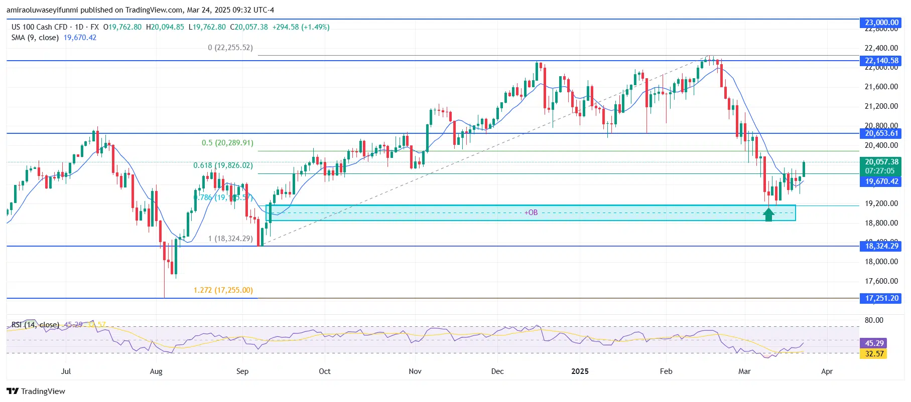 NAS100 is showing signs of a bullish recovery from a key support level. The 9-day SMA currently stands at $19,670, and the price is trading above it, indicating a short-term bullish trend. The RSI is at 45 and gradually rising from the oversold zone, suggesting increasing buying pressure. If the RSI moves above 50, it could confirm stronger bullish momentum and indicate a potential continuation of the upward move.