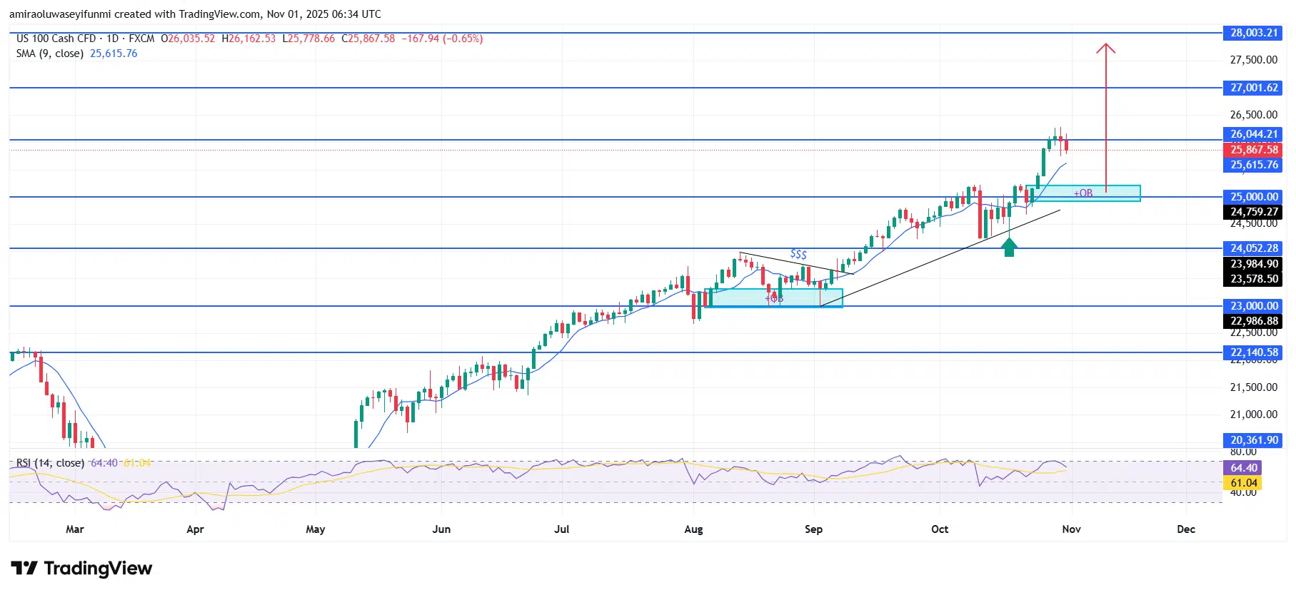Looking ahead, NAS100 appears favorably positioned to target the $27,000 resistance area, which stands as a critical decision point for bullish participants. A confirmed breakout above this region could extend momentum toward $28,000, supported by persistent optimism across global equity markets. Should short-term retracements occur, the $25,000–$25,600 range is expected to act as a firm demand zone, cushioning temporary declines and encouraging renewed buying activity as seen in consistent forex signals across correlated markets.