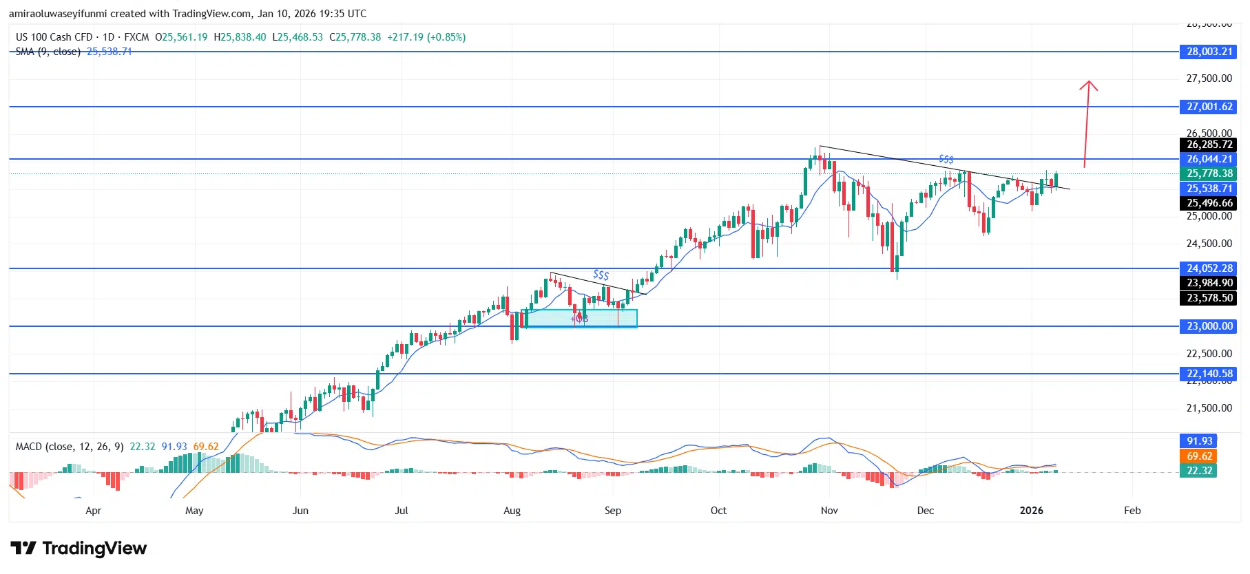 NAS100 upward bias reinforced by structural strength and momentum stability. NAS100 remains positioned on the front foot on the daily chart, with price consistently holding above the 9-day simple moving average near $25,540. Momentum conditions continue to favor upside continuity, as the MACD remains in positive territory with expanding histogram bars that signal steady demand rather than emerging supply pressure. This configuration suggests that market participation remains tilted toward buyers, even as price action experiences brief pauses.