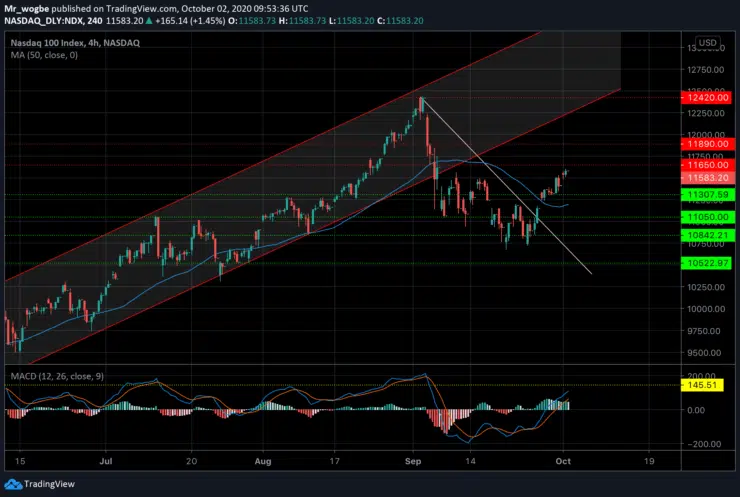 The NDX has recovered firmly from its recent drop to the 10670 area and is now trading close to the key 11650 resistance. The index has shown strong bullishness over the past few days, and we could see the 12000 price level once again.