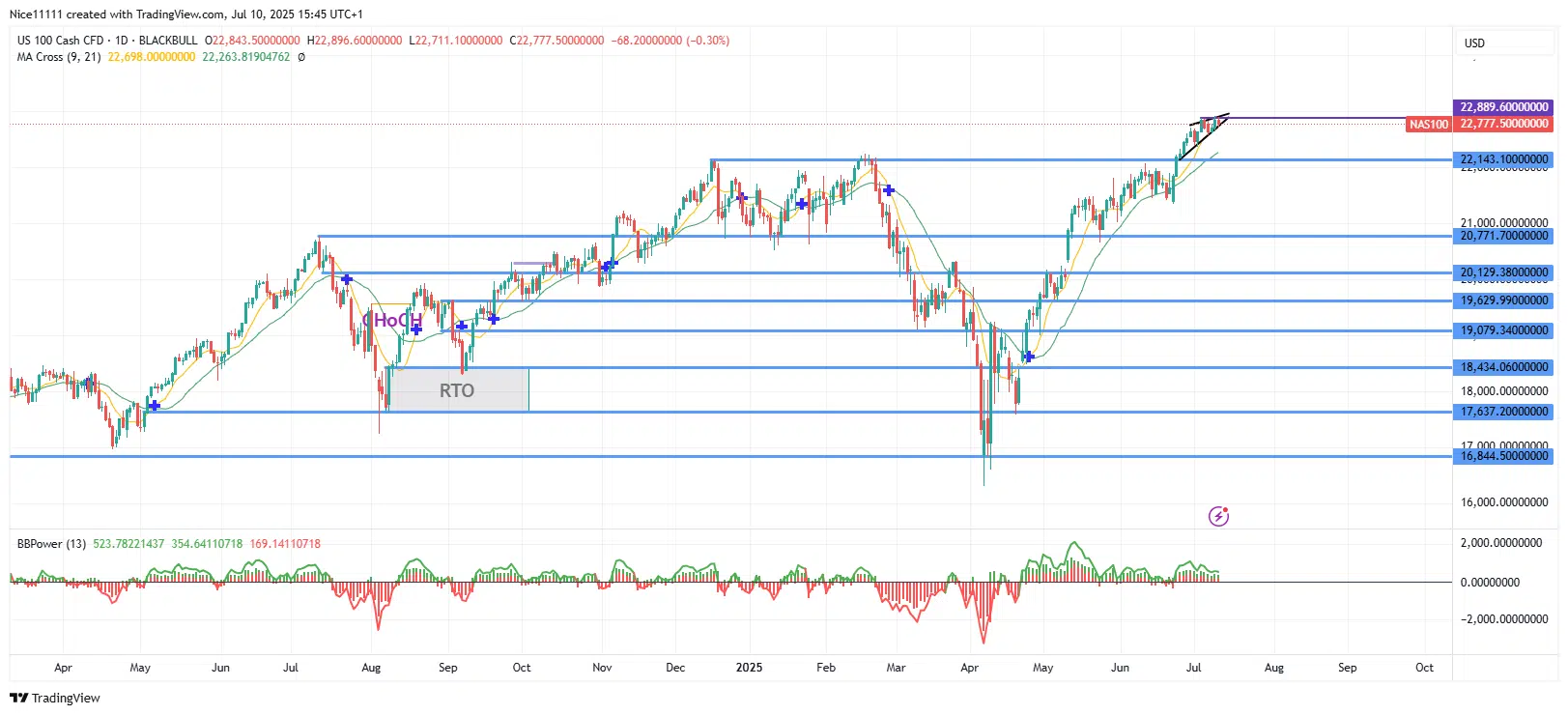 The Moving Average string crossover in April initiated a structural shift in price direction. This crossover signaled the start of a sharp bullish rally that quickly approached the former all-time high of 22143.0. Throughout the climb, the 9-period Moving Average consistently acted as dynamic support, strengthening the bullish momentum. Following a test of the resistance zone at 22143.0, the price experienced a brief pullback before finding fresh support on the Moving Averages—propelling a breakout beyond the previous high.