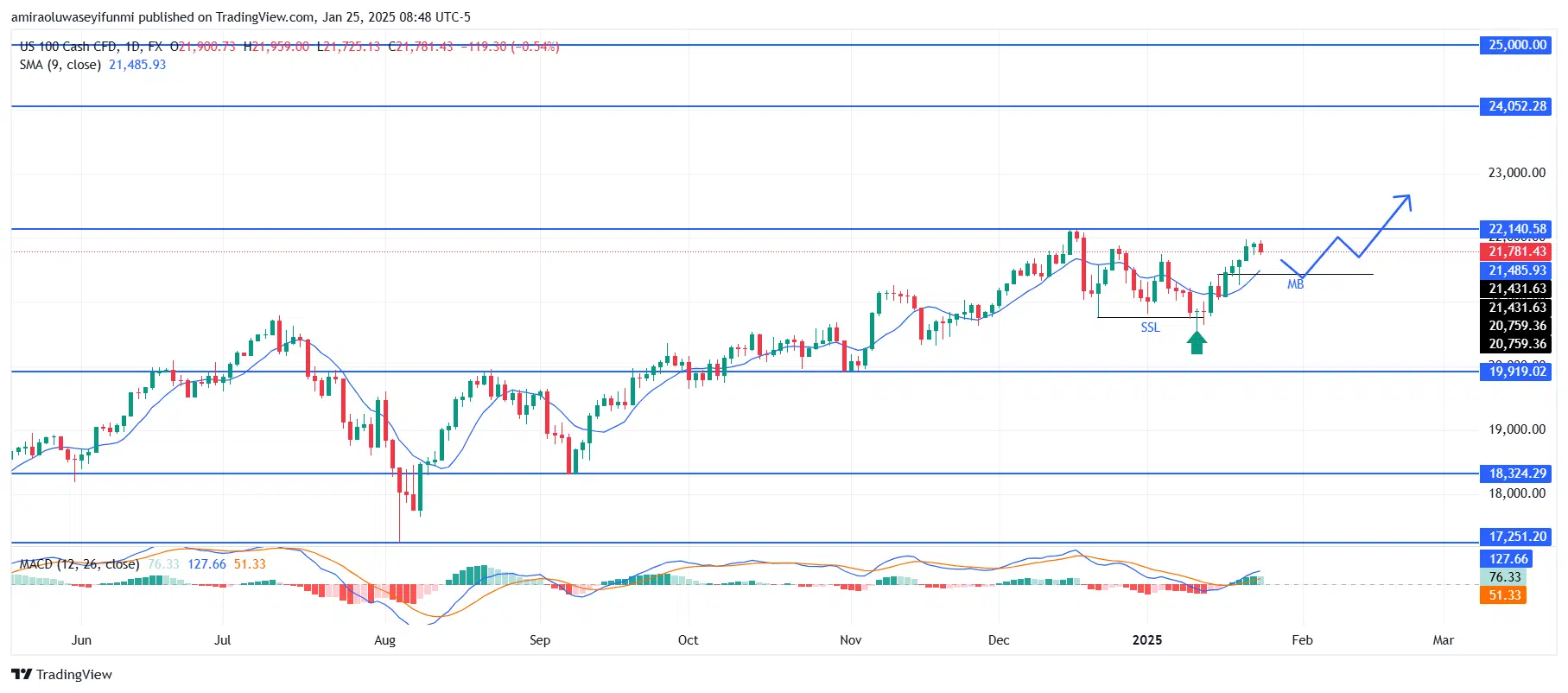NASDAQ100 targets bullish momentum amid key resistance levels. Indicators on the NAS100 daily chart highlight strong bullish momentum. The 9-day SMA at $21,490 serves as dynamic support, with prices consistently trading above it. The MACD histogram remains positive, and its signal line has crossed above the zero level, confirming upward momentum. These indicators reflect sustained buying pressure, reinforcing the current bullish bias.