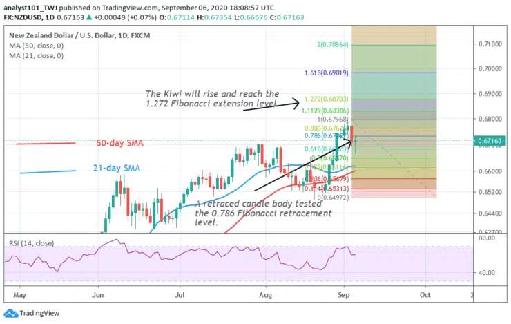 NZD/USD pair was earlier in a downtrend but has resumed the uptrend. A retraced candle body tested the 0.786 Fibonacci retracement level. The Kiwi will rise and reach the 1.272 Fibonacci extension level or 0.6900 high. At this level, the market will reverse and return to the 78.6% Fibonacci retracement level. But the reversal will not immediate.