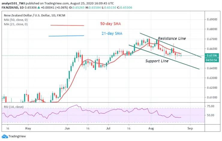 NZD/USD pair is in a downward move after testing level 0.6700. The pair is drawn in an ascending channel. It has been falling after the resistance was tested twice. The downward move will persist if price breaks below the support line.