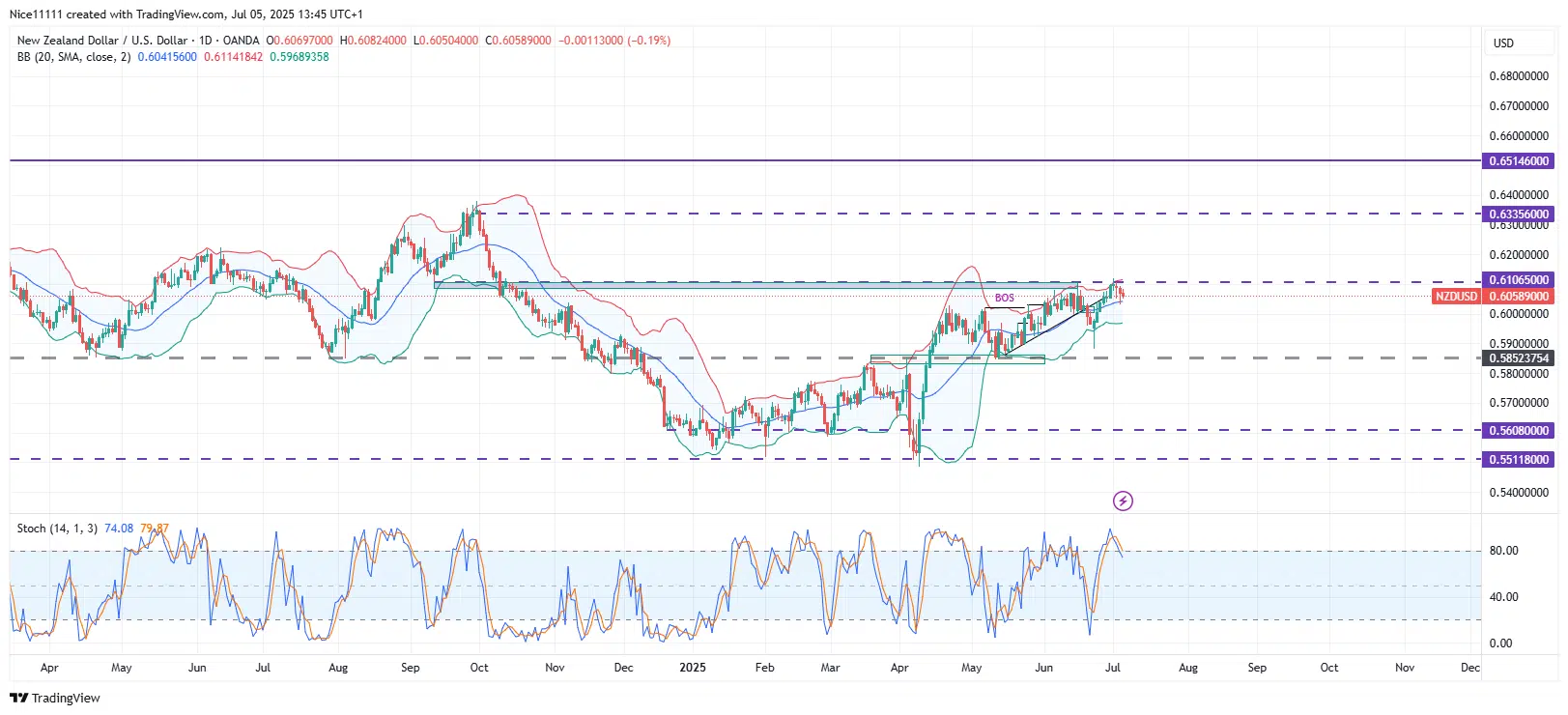 The market has now formed a double top at 0.6110, a direct result of testing an opposing breaker block acting as resistance to further upward movement. Additionally, the Stochastic indicator signals an overbought condition. The ascent to 0.6110 created fair value gaps, which may serve as retracement zones to regain momentum for a possible breakout.