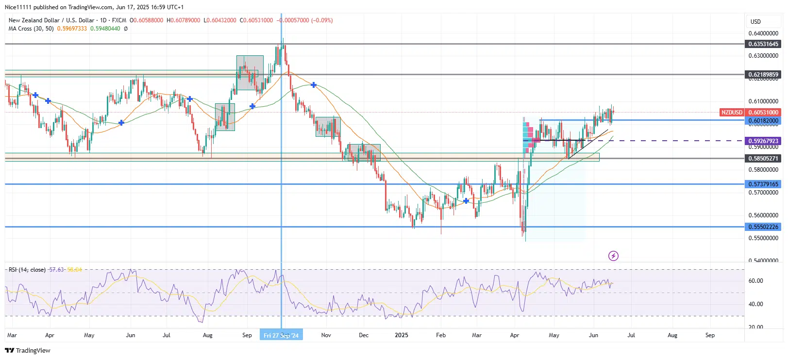The NZDUSD pair has demonstrated a notable but slowing bullish trajectory since its explosive breakout in April. The initial surge saw prices rally impulsively before encountering strong resistance at the 0.60180 level, prompting a significant retracement. After finding solid footing at the 0.5850 support zone, the pair resumed its upward movement, though the advance has lacked the conviction and velocity of the initial reversal phase.