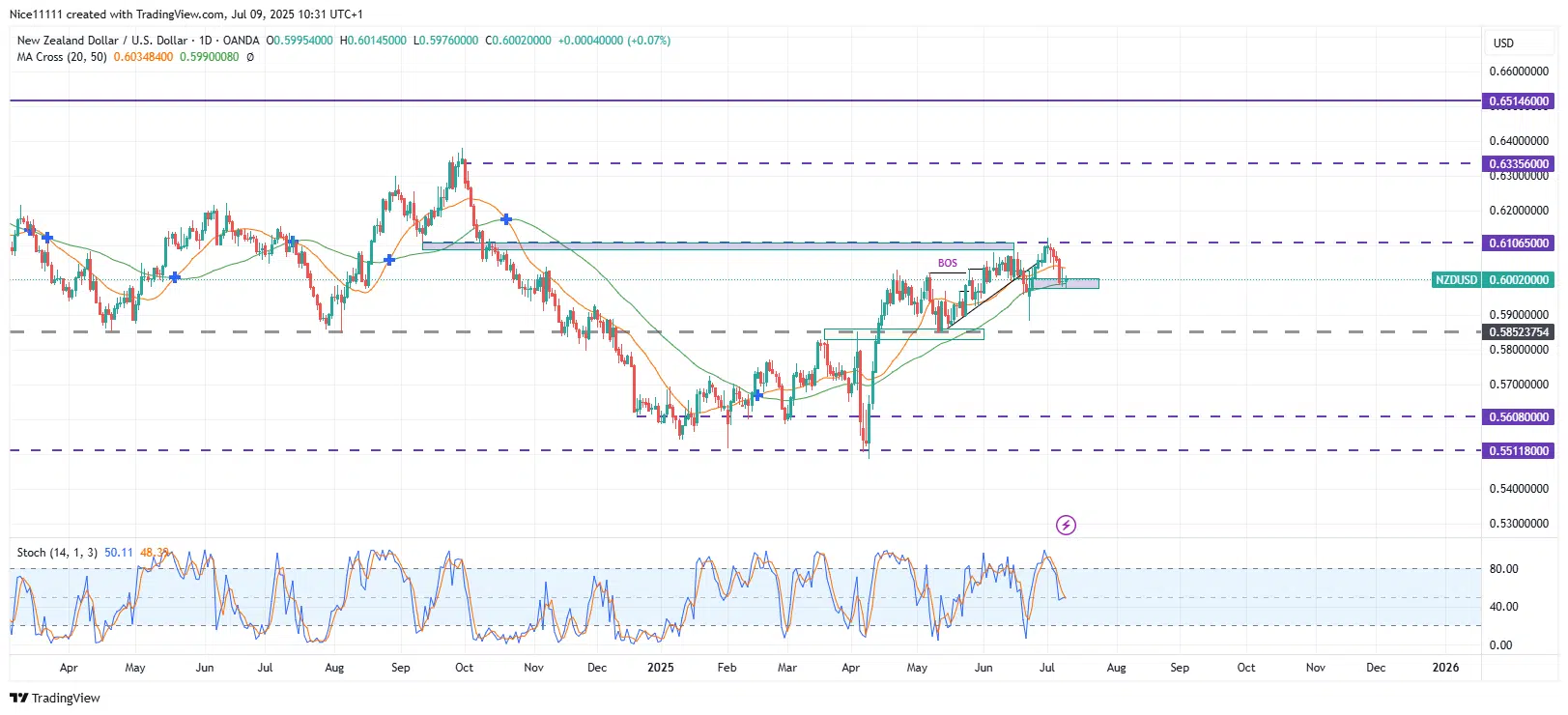 Despite two attempts to breach 0.61070, the pair faced strong rejection, confirming the presence of resistance. The Stochastic oscillator indicated overbought conditions at this level, reinforcing the risk of reversal. The subsequent decline has pushed the price into a fair value gap (FVG), which could offer temporary support. However, with NZD/USD now trading below the 20-period Moving Average and threatening to break the 50-period MA, downside risks are growing.