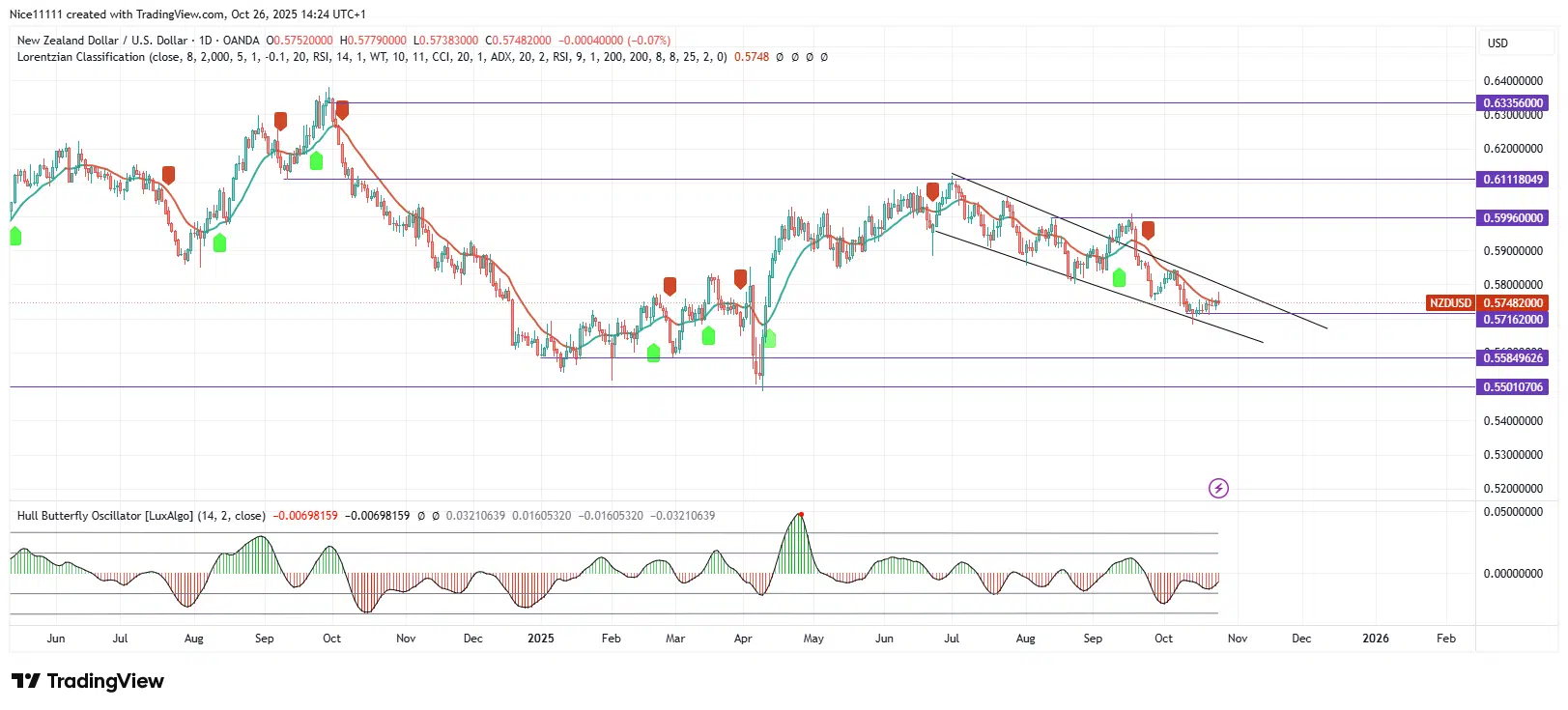 Interestingly, in September, the price briefly moved above the channel. However, it quickly crashed back inside the structure. That move caused confusion in indicator behavior for a short period. For instance, the Machine Learning Lorentizan Classification indicator flashed a temporary buy signal before reverting to a strong sell setup. Likewise, the Hull Butterfly Indicator showed a short-lived disturbance before realigning with the bearish momentum. Therefore, the downtrend remains intact despite the temporary retracement.