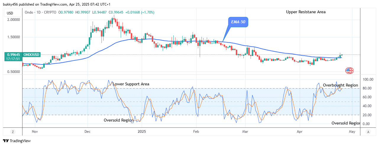 At the time of writing this article, after completing the downward move at the $0.944 low value, the price of Ondo rallied to a $0.999 resistance level above the EMA-50 as the 4-hourly chart opened today, resulting in an intraday gain for the coin buyers.