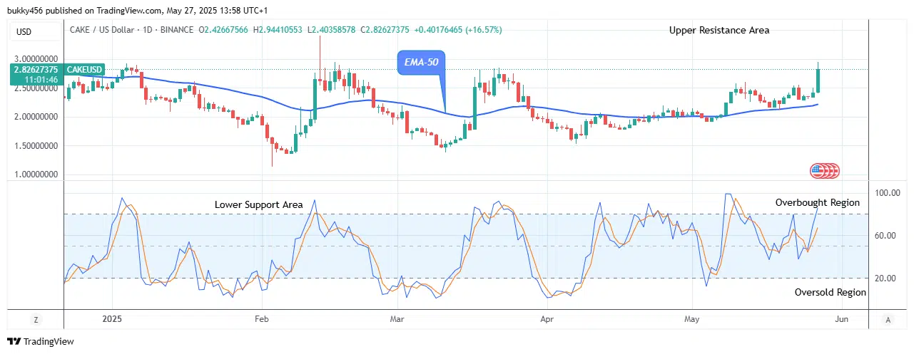 The CAKEUSD price might head towards the upper channel as the bulls made an impressive rally to a $2.84 high mark above the EMA-50 as the 4-hourly chart opens today, attracting an unusually high number of new entrants into the market.