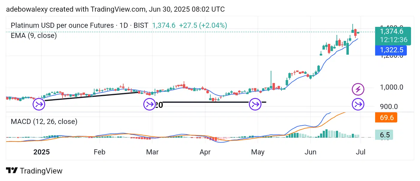 The XPT market is currently trading above the 1,350 price level. In fact, the 1,400 level has been tested for a breakout over the past two sessions. Today’s session, as of the time of writing, offers hope that the market may extend its upward correction through this psychological barrier, as it stands above the 9-day Exponential Moving Average (EMA) line.