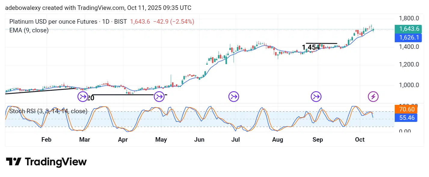 On the daily chart, the Platinum market still shows signs that bullish momentum is holding firm. The latest price candle remains green, although price action still lies slightly below the 9-day EMA curve.