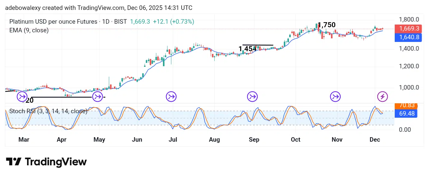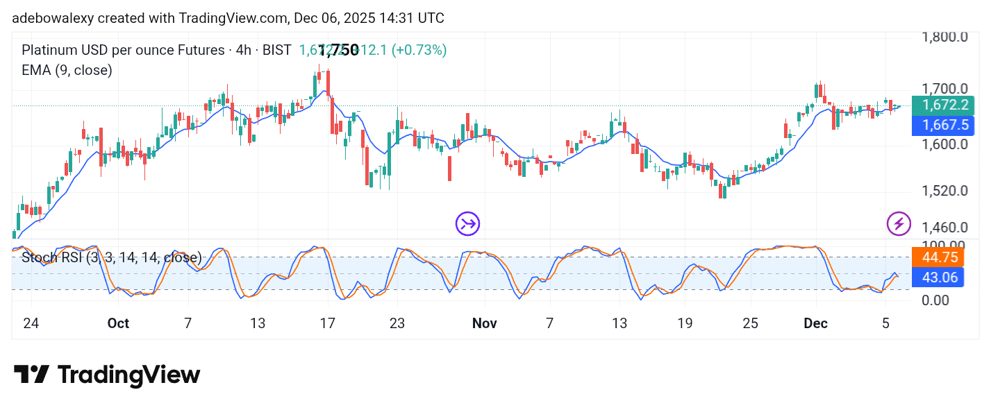 On the 4-hour Platinum price chart, signs of upward pressure are visible, reflected in the last two green candles. However, their small size is a drawback, and the latest candle sits slightly lower than the one before it. Even so, trading remains above the 9-day EMA line.