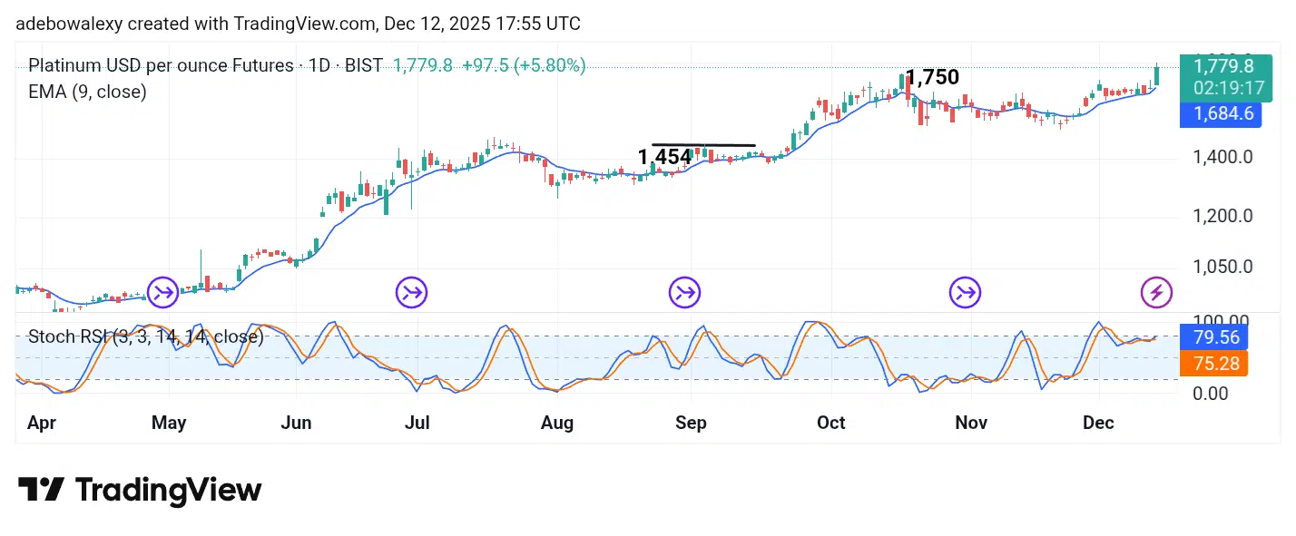 Also, trading remains above the 9-day EMA curve. Furthermore, the SRSI indicator lines are above the 80 mark of the SRSI indicator. However, the lines of the indicator have already delivered a downward crossover due to the ongoing session. Albeit, since trading remains above the 9-day EMA curve, there is hope of advancement towards the $1,800 mark.