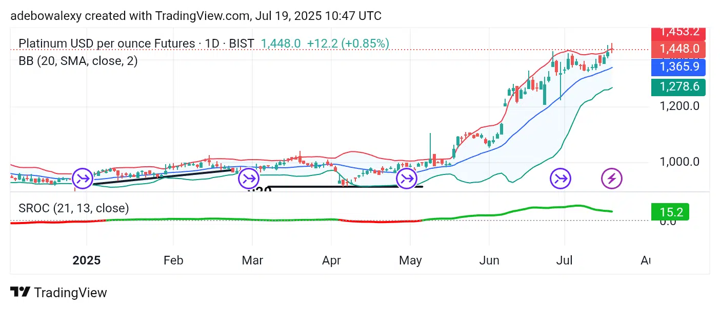 Bullish pressure has persisted in the XPT daily market, resulting in price action successfully breaching the 1,400 price level. The market now trades above this level at a notable height. The latest price candle appears red and compressed but remains near the upper boundary of the Bollinger Bands (BB) indicator.