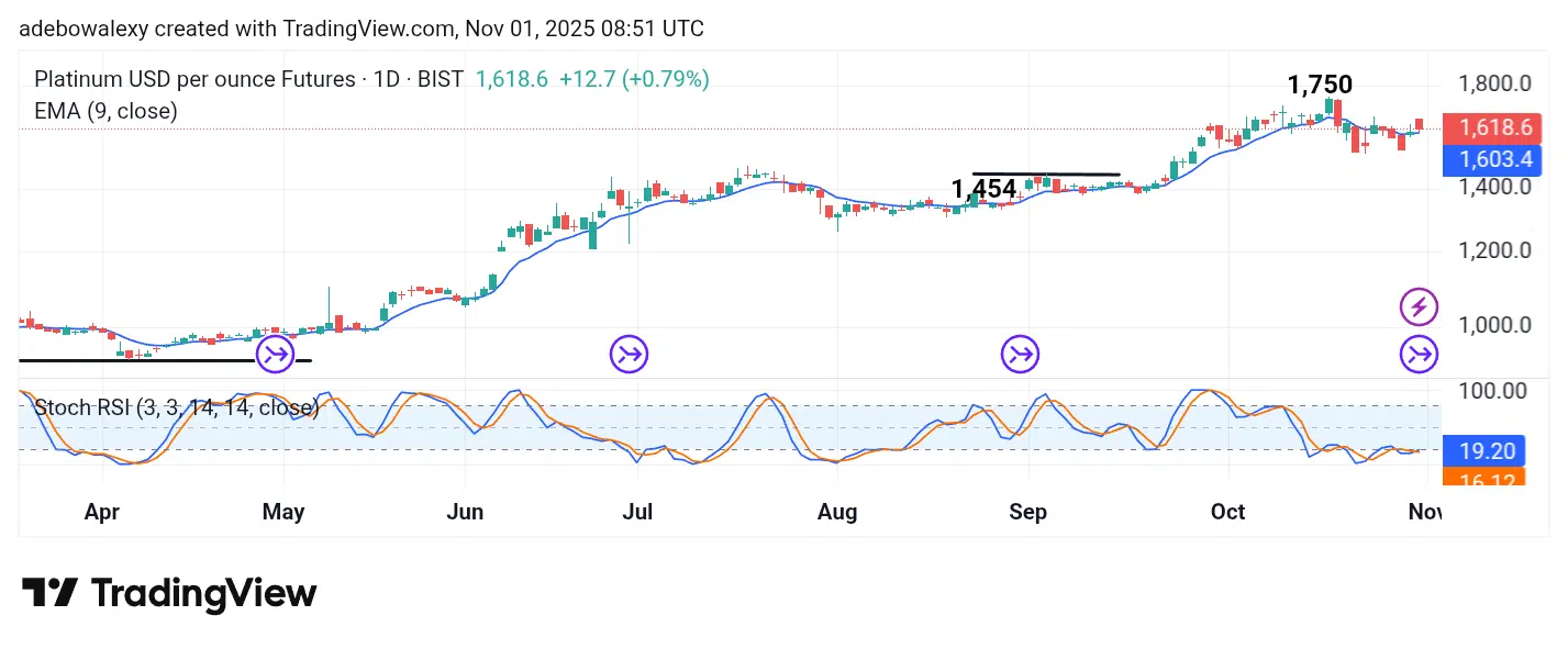 As mentioned earlier, the XPT market has remained relatively stable. However, the market dipped below the 9-day Exponential Moving Average (EMA) line during the week but soon recovered above it toward the close.